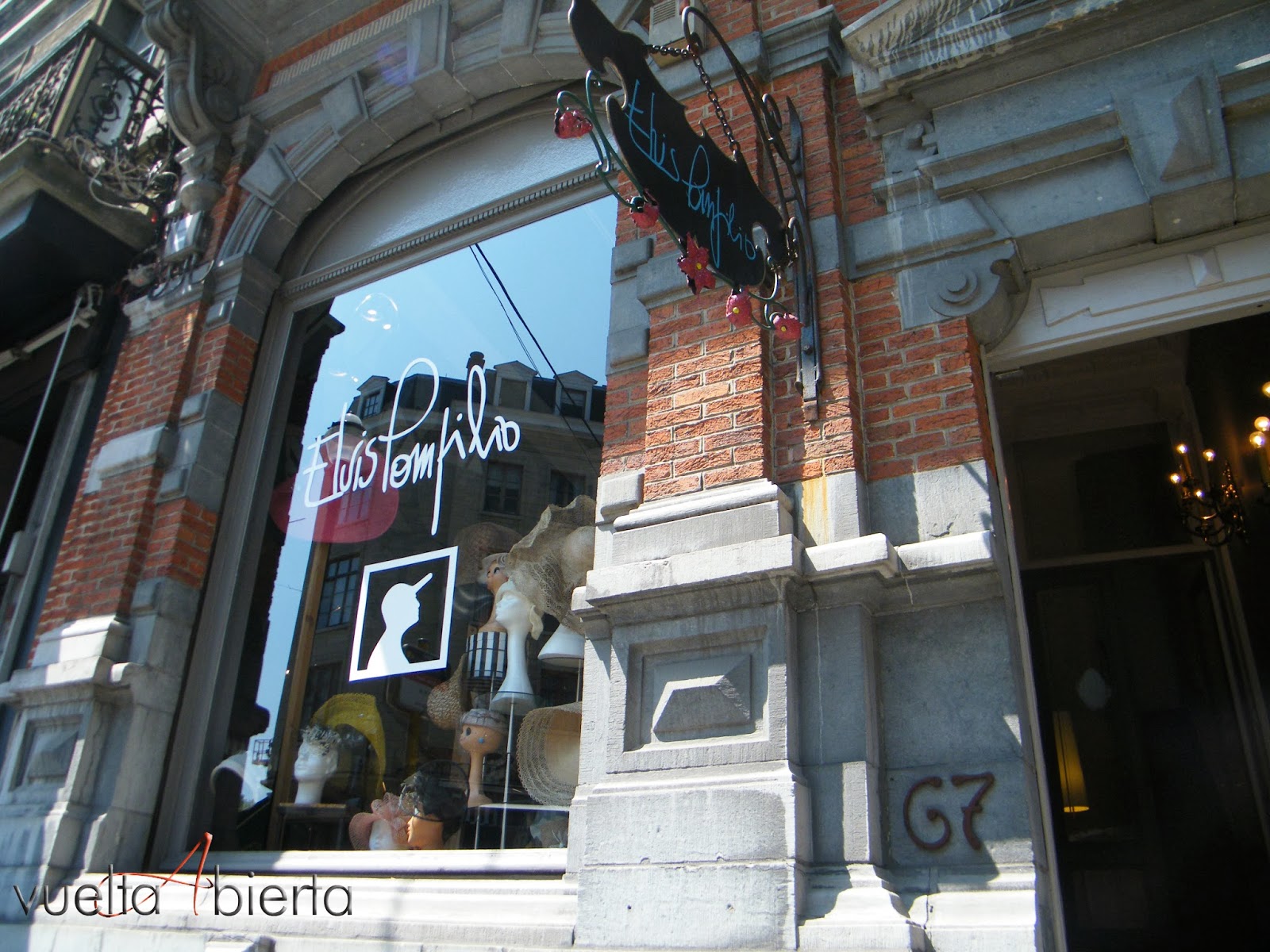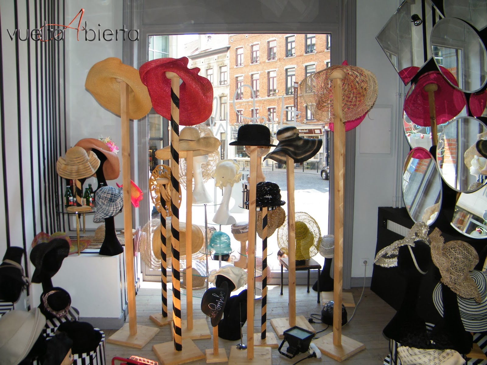 Nada más entrar en el taller de Elvis Pompilio supe que aquel lugar iba a convertirse muy pronto en una Vuelta Abierta. Las razones estaban clarísimas: una decoración sorprendente con espejos redondos y mágicos en los que verse reflejado cientos de veces; una ubicación única en pleno Grand Sablon bruselense, con un ventanal de ensueño y un bucólico patio en la parte posterior; un diseñador cercano, encantado de probar sus creaciones a los clientes; y unos sombreros hechos a mano, originales y exclusivos. Absolutamente irresistible.